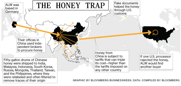 “Chinese honey has long had a poor reputation in the U.S., where – in 2001 – the Federal Trade Commission imposed stiff import tariffs or taxes to stop the Chinese from flooding the marketplace with dirt-cheap, heavily subsidized honey, which was forcing American beekeepers out of business. To avoid the dumping tariffs, the Chinese quickly began transshipping honey to several other countries, then laundering it by switching the color of the shipping drums, the documents and labels to indicate a bogus but tariff-free country of origin for the honey.”